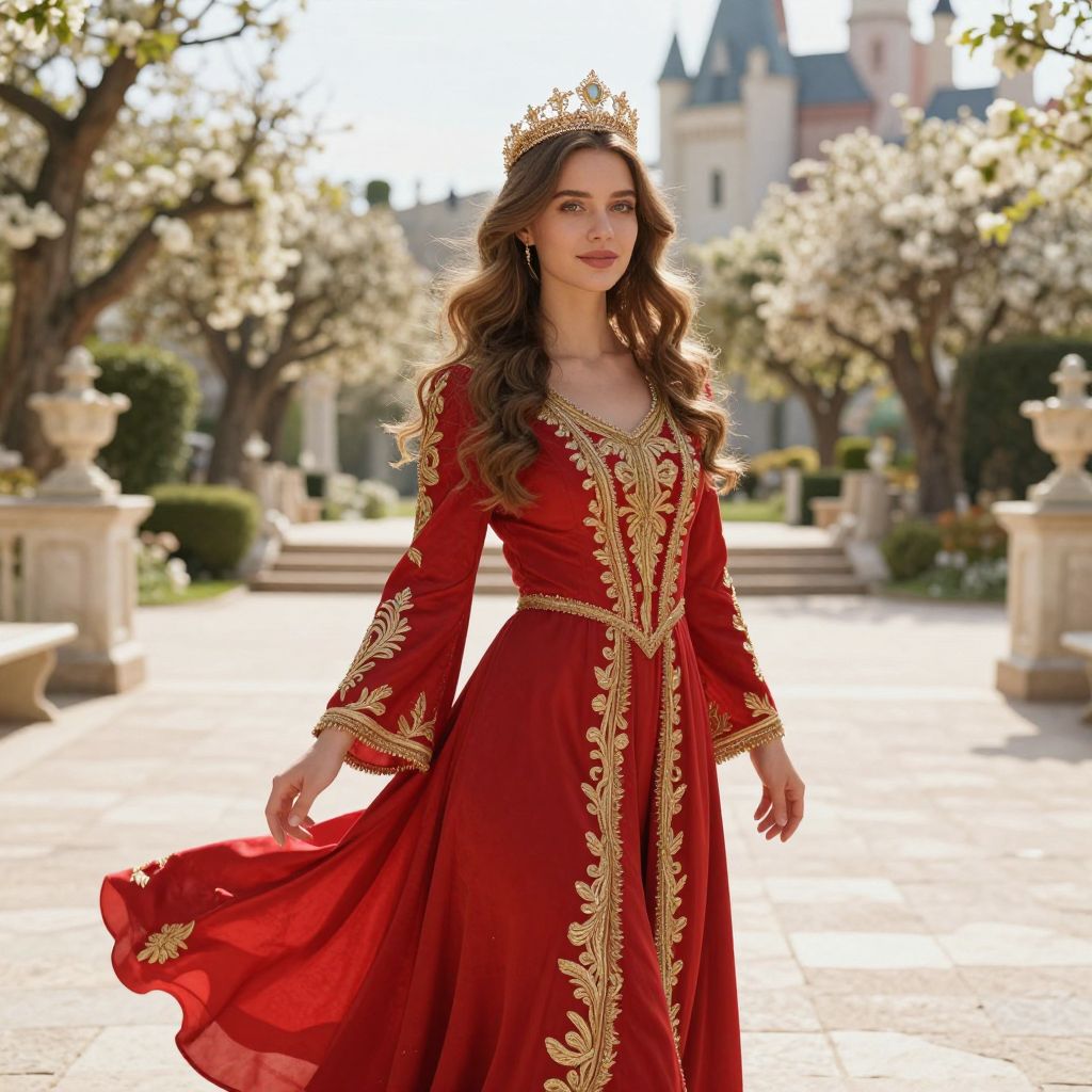 Woman in Regal Red and Gold Embroidered Gown Wearing Crown Outdoors