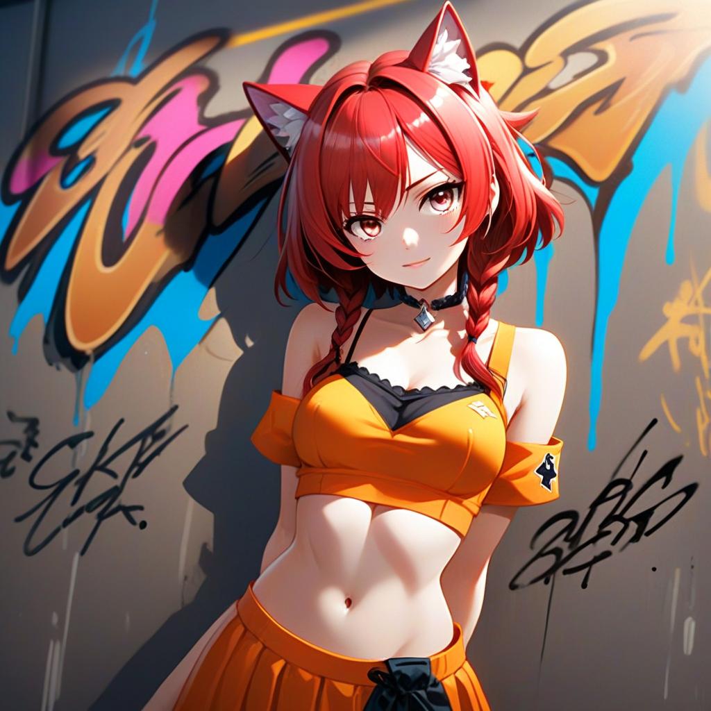 This vibrant digital illustration features a confident anime-style woman with striking red hair styled in twin braids and cat ears headband. She wears a trendy orange crop top and matching skirt, standing against a graffiti-covered wall that adds an urban street art vibe to the composition. The image combines elements of modern anime aesthetics with bold, dynamic colors and sharp shading techniques.