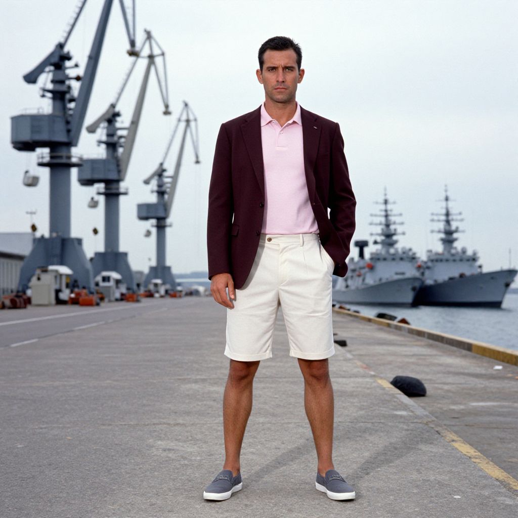A man stands confidently on a dock near a port, dressed in a stylish maroon blazer over a light pink polo shirt and white shorts, paired with grey slip-on shoes. In the background, large industrial cranes and naval ships create a contrasting industrial maritime atmosphere.
