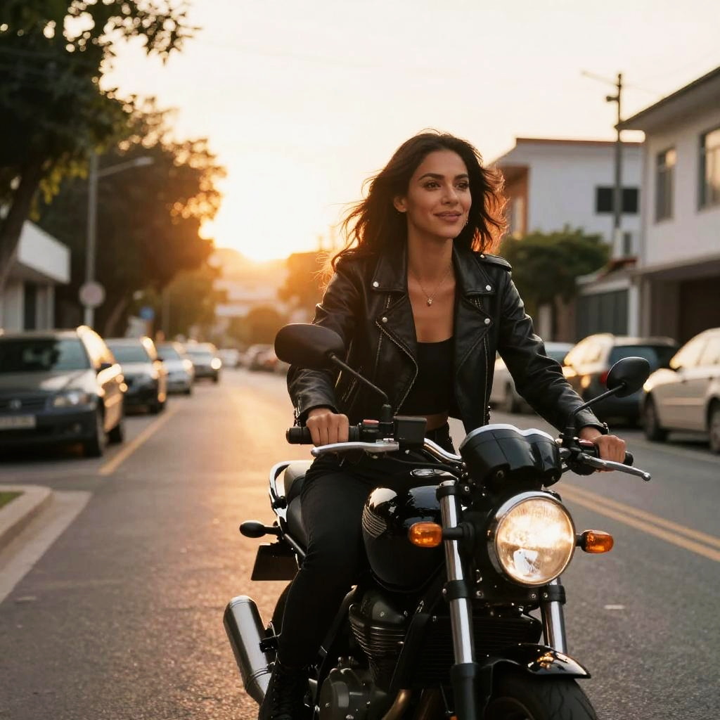 A confident woman rides a classic black motorcycle down a city street during sunset, capturing the warm golden hour light. She wears a stylish black leather jacket and has a relaxed, content expression, embodying freedom and adventure in an urban setting.