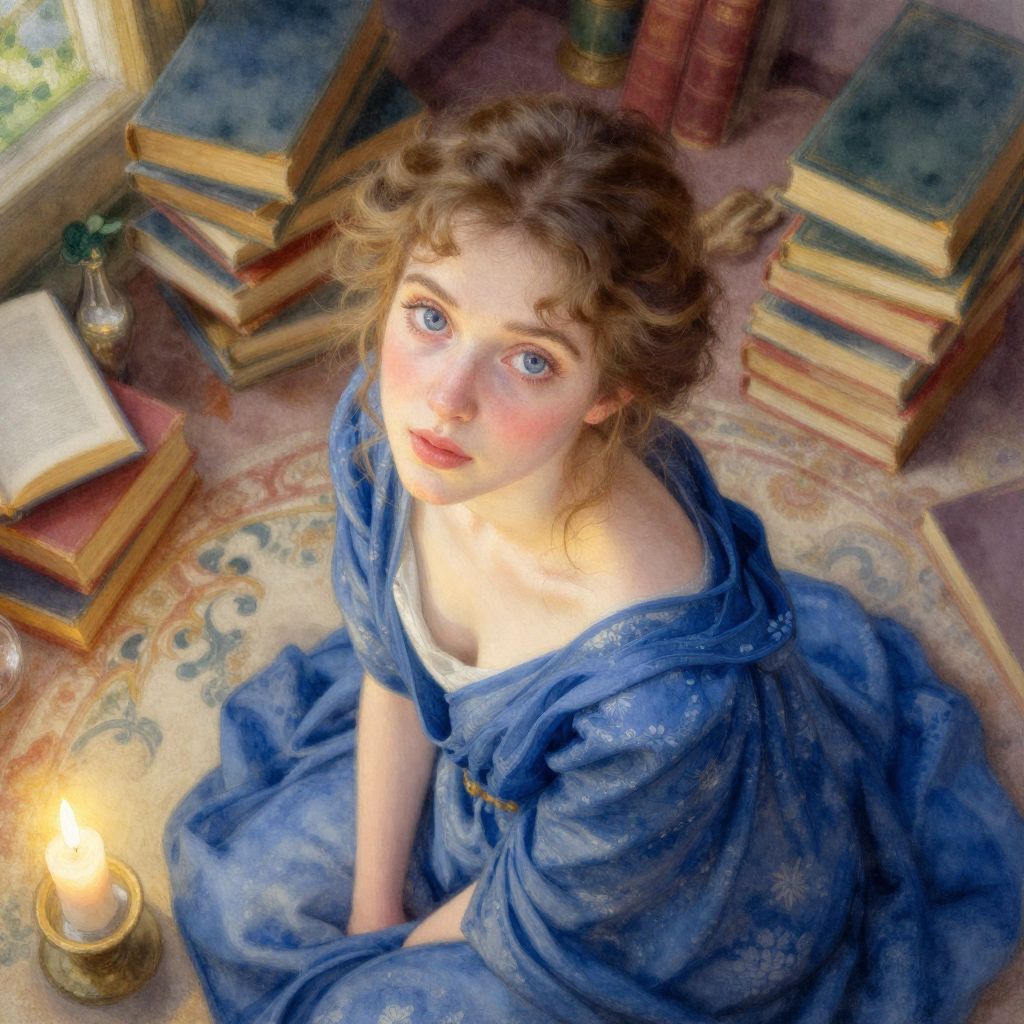 A young woman dressed in a flowing blue gown sits gracefully on a patterned rug surrounded by stacks of old books, illuminated softly by candlelight. The image showcases a romantic, painterly style reminiscent of classical portraiture, emphasizing delicate brushwork and a warm, nostalgic atmosphere.