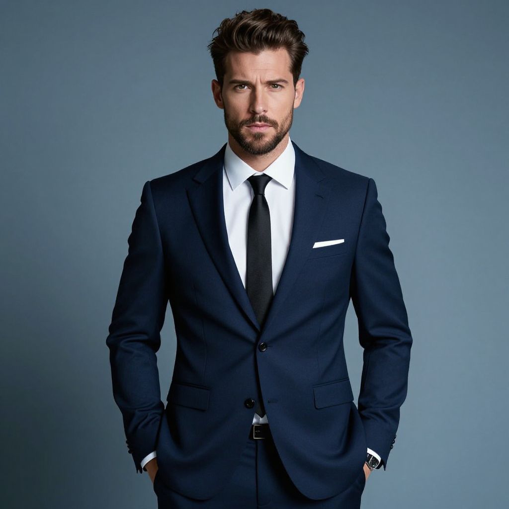 Confident Man in Navy Blue Suit with Black Tie