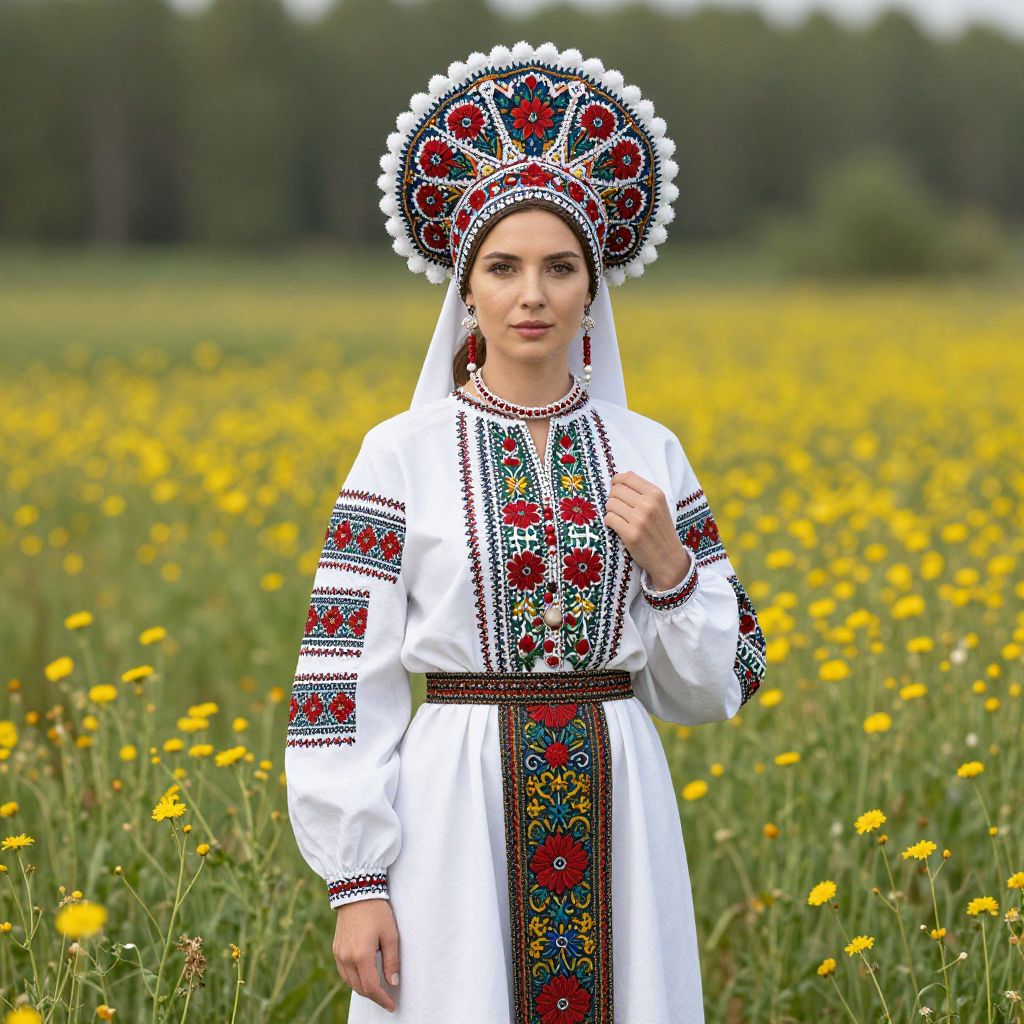 A woman stands in a field of yellow flowers wearing a traditional Eastern European folk costume adorned with intricate red, green, and blue embroidery. The outfit features a detailed headdress and matching belt, highlighting cultural heritage and craftsmanship.