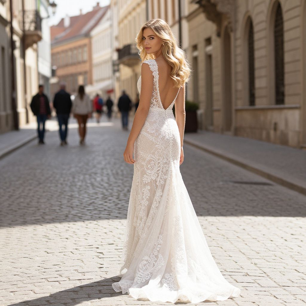 A woman stands gracefully on a cobblestone street wearing a stunning lace wedding gown with a deep V-back design. The elegant dress features intricate floral patterns and a flowing train, perfectly complemented by her loose wavy blonde hair. The urban setting with blurred pedestrians and historic buildings adds a timeless romantic atmosphere to the scene.