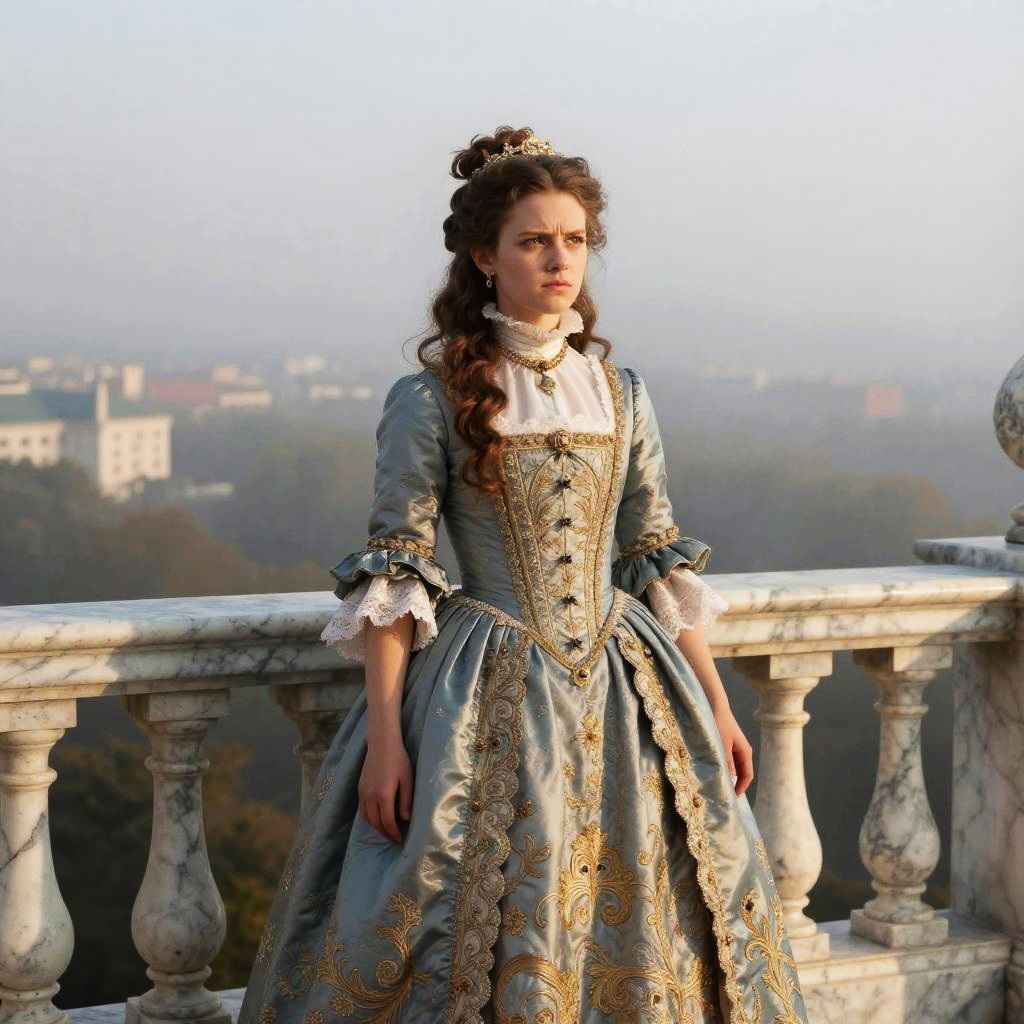 A woman stands on a marble balcony overlooking a foggy cityscape, dressed in an exquisite blue and gold Rococo-style gown adorned with intricate embroidery and lace details. Her hair is styled in soft curls, complemented by a delicate tiara, reflecting the elegance and fashion of 18th-century aristocracy.
