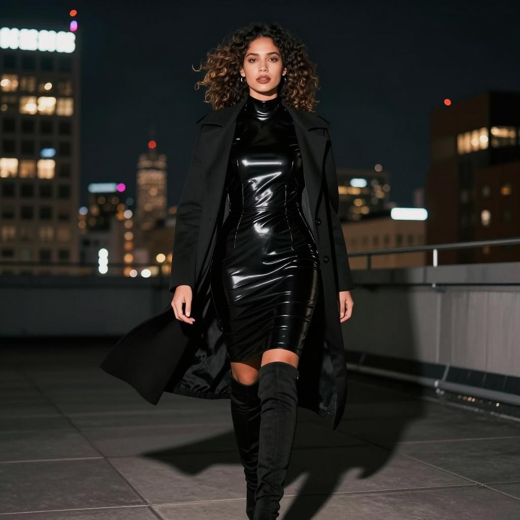 A confident woman walks on a rooftop at night, dressed in a sleek, black vinyl dress paired with a long black coat and thigh-high boots. The urban cityscape with illuminated buildings creates a stylish and modern backdrop, capturing the essence of edgy nighttime fashion.