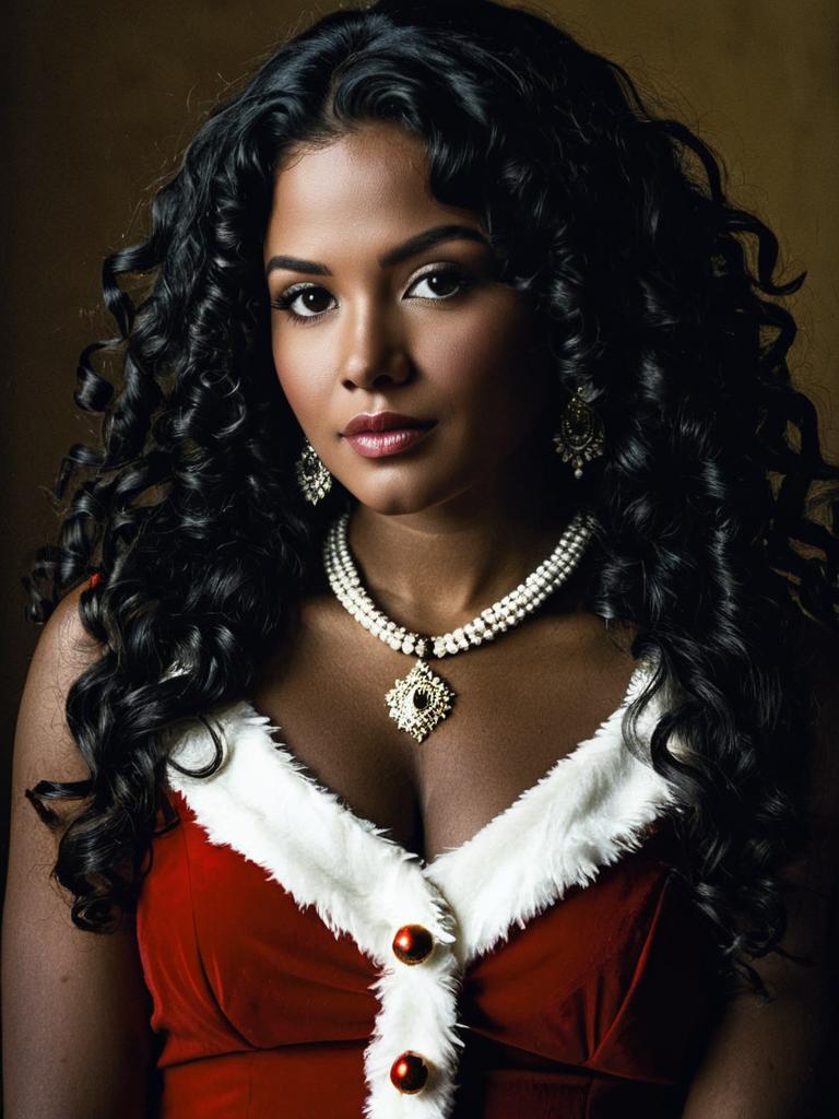 A striking portrait of a woman with long, curly black hair dressed in a festive red Santa-inspired dress trimmed with white fur. She is adorned with elegant jewelry, including a pearl necklace with a pendant and matching earrings, set against a warm, neutral background, highlighting her radiant skin and confident expression.