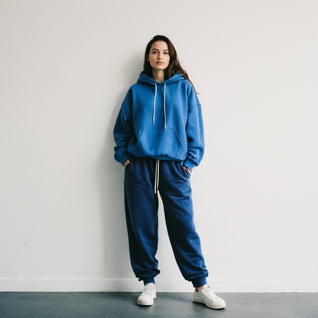 A woman stands confidently against a plain white wall, dressed in an oversized blue hoodie and matching jogger sweatpants. The casual athleisure outfit paired with white sneakers highlights a relaxed, modern streetwear style.