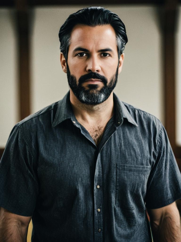A serious man with a neatly groomed beard and salt-and-pepper hair, dressed in a casual dark striped button-up shirt, poses in a softly lit indoor setting. The image has a realistic, documentary-style portrait approach focused on the subject's facial features and expression.