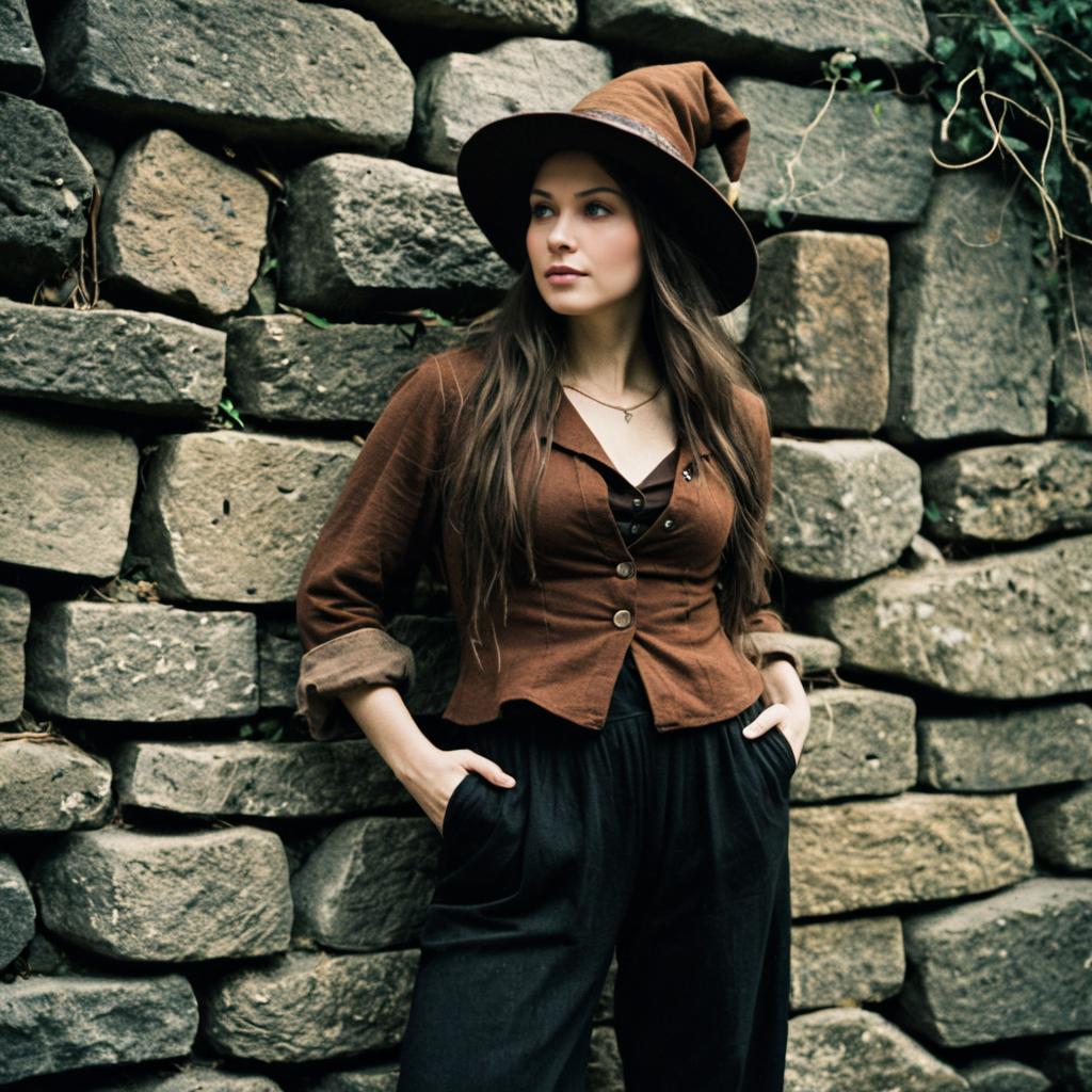 Woman in Radagast Brown Costume with Pointed Hat Standing by Stone Wall