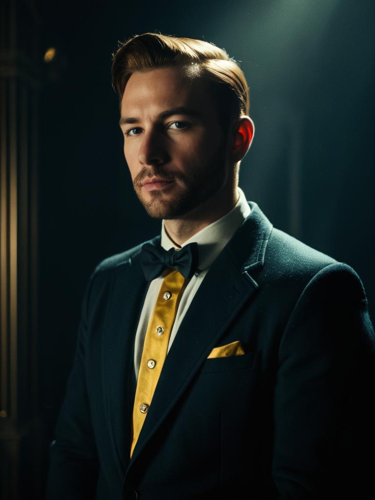 A photorealistic portrait of a man dressed in a sophisticated Tintin-inspired costume, featuring a classic black tuxedo with a striking yellow shirt front and matching pocket square. The cinematic lighting highlights his contemplative expression and meticulously styled hair, blending comic cosplay with elegant style.