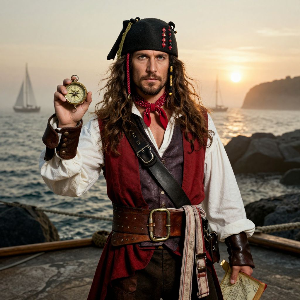A man dressed as a pirate stands on a rocky shore during sunset, holding a brass compass in one hand and an old map in the other. His long hair, tricorn hat with beads, and period costume enhance the adventurous seafaring theme against the backdrop of sailing ships and calm ocean waters.