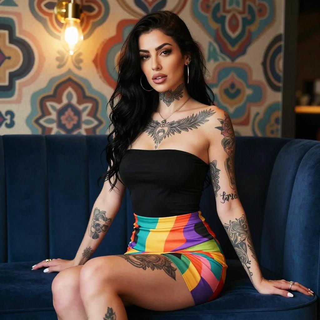 A confident woman with long black hair and extensive tattoos poses seated on a plush blue sofa against a colorful patterned wall. She wears a strapless black top paired with a vibrant, rainbow-striped skirt, complemented by hoop earrings and subtle makeup, creating a striking and stylish portrait.