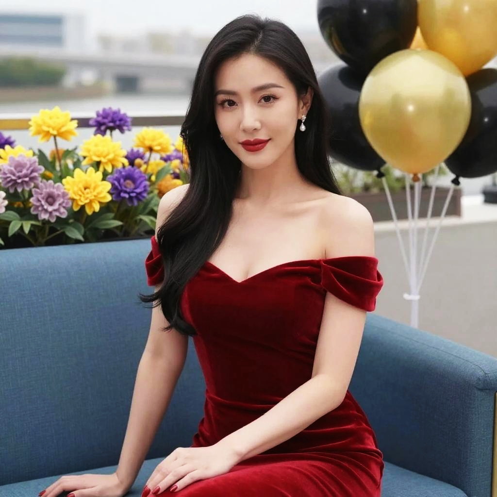 A stylish woman sits gracefully on a blue couch wearing an elegant off-shoulder red velvet dress. She poses with confidence against a backdrop of vibrant yellow and purple flowers and black and gold balloons, creating a sophisticated and celebratory atmosphere.