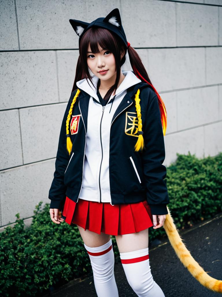 A woman cosplaying as Asakura Karen from the game Heaven Burns Red stands confidently against an urban backdrop. She wears a black hoodie with cat ears, a red pleated skirt, white thigh-high socks with red stripes, and a distinctive yellow cat tail, capturing the anime-style character's playful and bold aesthetic.
