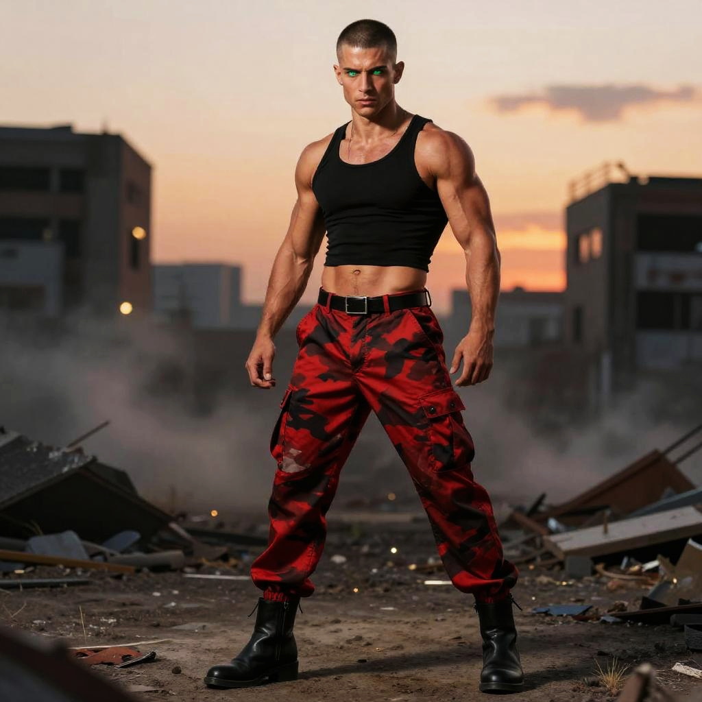 A muscular man stands confidently in an urban, post-apocalyptic setting at sunset, wearing a black tank top and red camouflage cargo pants with black boots. His intense gaze features digitally altered glowing green eyes, giving the image a futuristic and dramatic atmosphere reflective of Gen Z-inspired fashion and sci-fi influences.