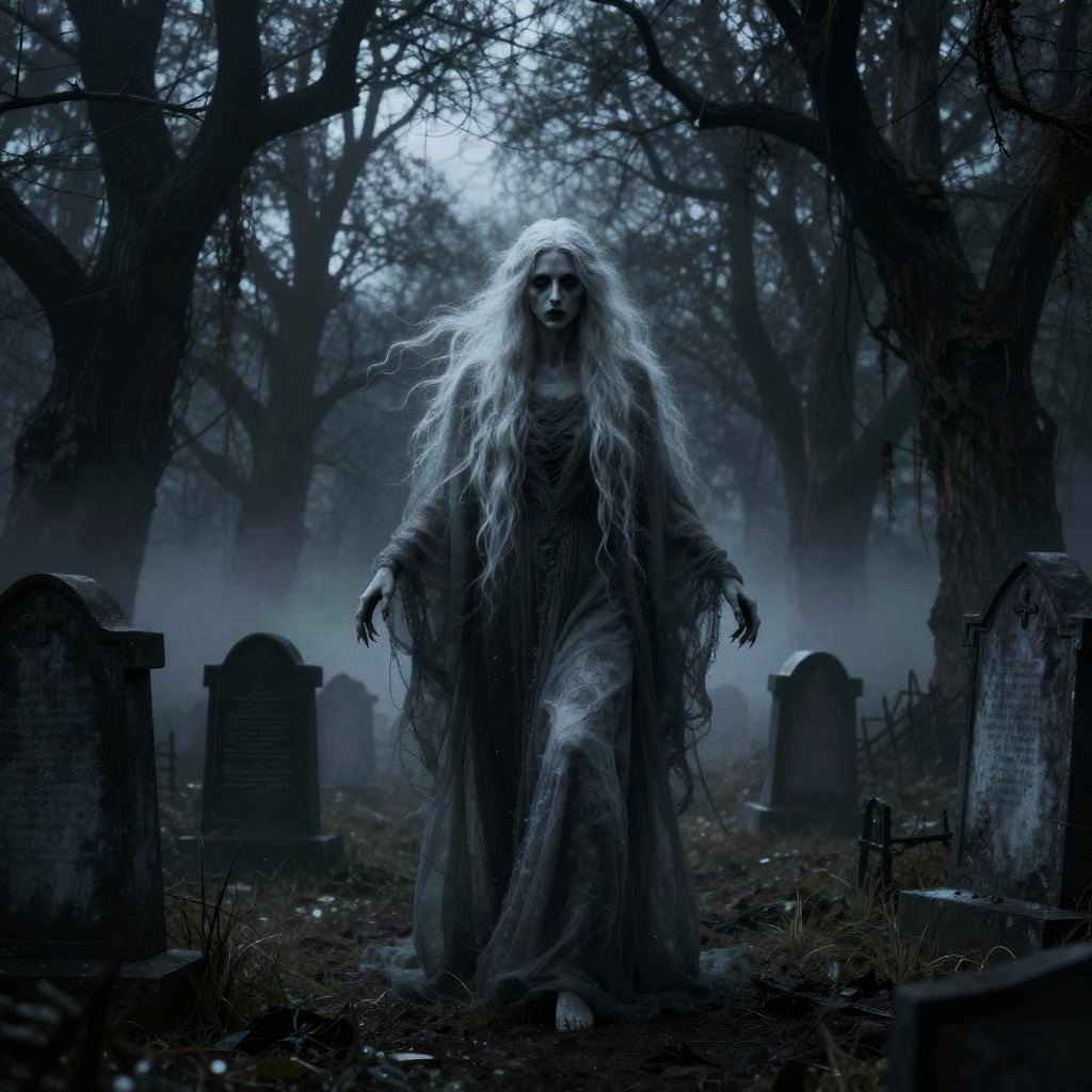 A ghostly woman with long flowing white hair and a tattered dark gown eerily walks through an ancient, fog-covered graveyard surrounded by twisted trees. The haunting atmosphere is intensified by the mist and dim, muted lighting, creating a chilling gothic horror scene.
