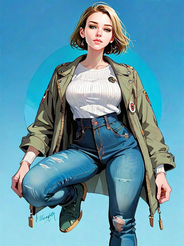 This digital illustration features a confident woman in a full-body pose, styled in casual modern clothing including a white ribbed top, high-waisted ripped jeans, and an olive-green jacket adorned with patches. Rendered in a realistic comic art style, the artwork combines detailed facial expressions with dynamic shading and vibrant color contrasts against a simple blue background.