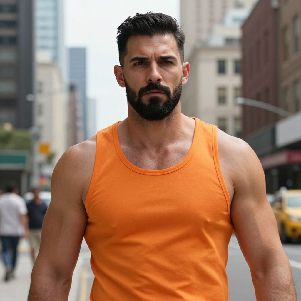 A muscular man with a beard and styled hair is standing confidently on a city street wearing a bright orange tank top. The urban background features tall buildings and blurred pedestrians, emphasizing the subject's determined expression and strong physique.
