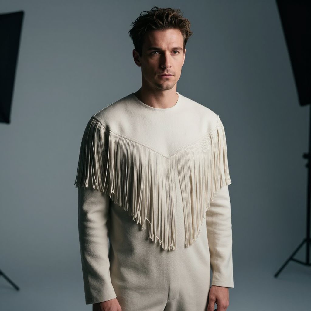 A man poses in a studio wearing a beige sweater adorned with long fringes that create a V-shaped pattern across the chest and shoulders. The minimalist background and soft lighting emphasize the texture and unique design of the fashion piece, showcasing a modern yet Western-inspired style.