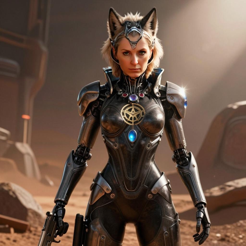 Futuristic Woman Warrior in Cybernetic Armor with Wolf Ears in Desert Landscape