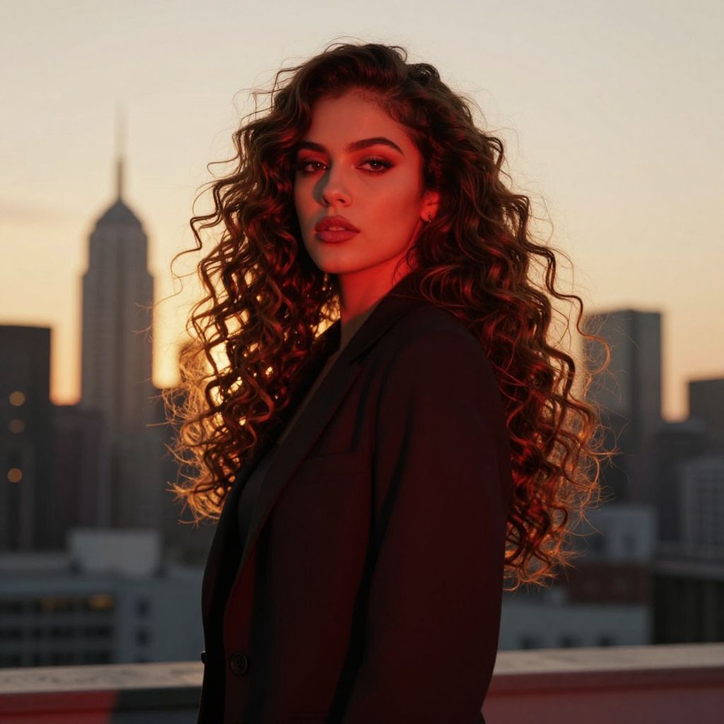 A confident woman with long, voluminous curly hair stands against a city skyline during golden hour, bathed in warm, soft sunlight. She wears a dark blazer, presenting a stylish and poised look with a subtle, serious expression in a modern urban setting.