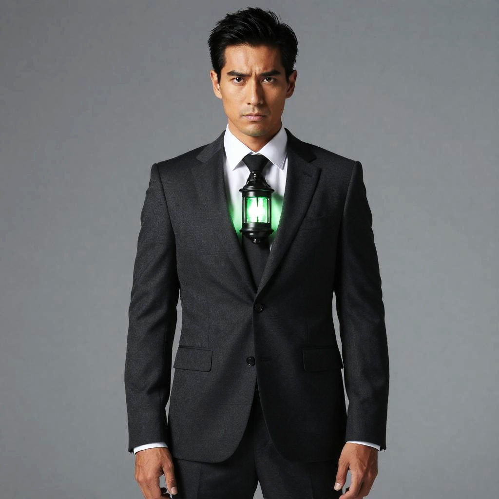 Man in Black Grey Suit with Glowing Green Lantern on Chest