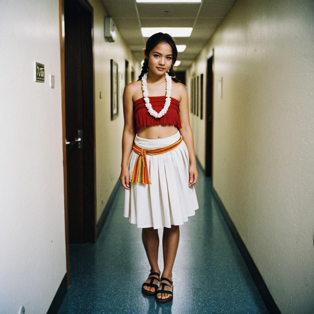A young woman stands in a hallway wearing a traditional-inspired hula skirt paired with a red fringe top and black sandals. She accessorizes with a white flower lei and a colorful sash tied around her waist, evoking a Polynesian or Hawaiian style costume.