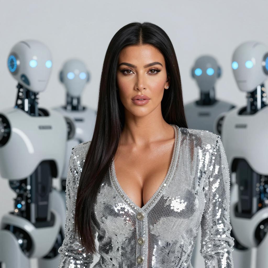 A woman poses confidently in a shimmering silver sequined outfit, standing prominently in front of a group of futuristic white robots with glowing blue eyes. The image captures a modern, high-tech aesthetic combined with glamorous fashion, set against a neutral background with a shallow depth of field.