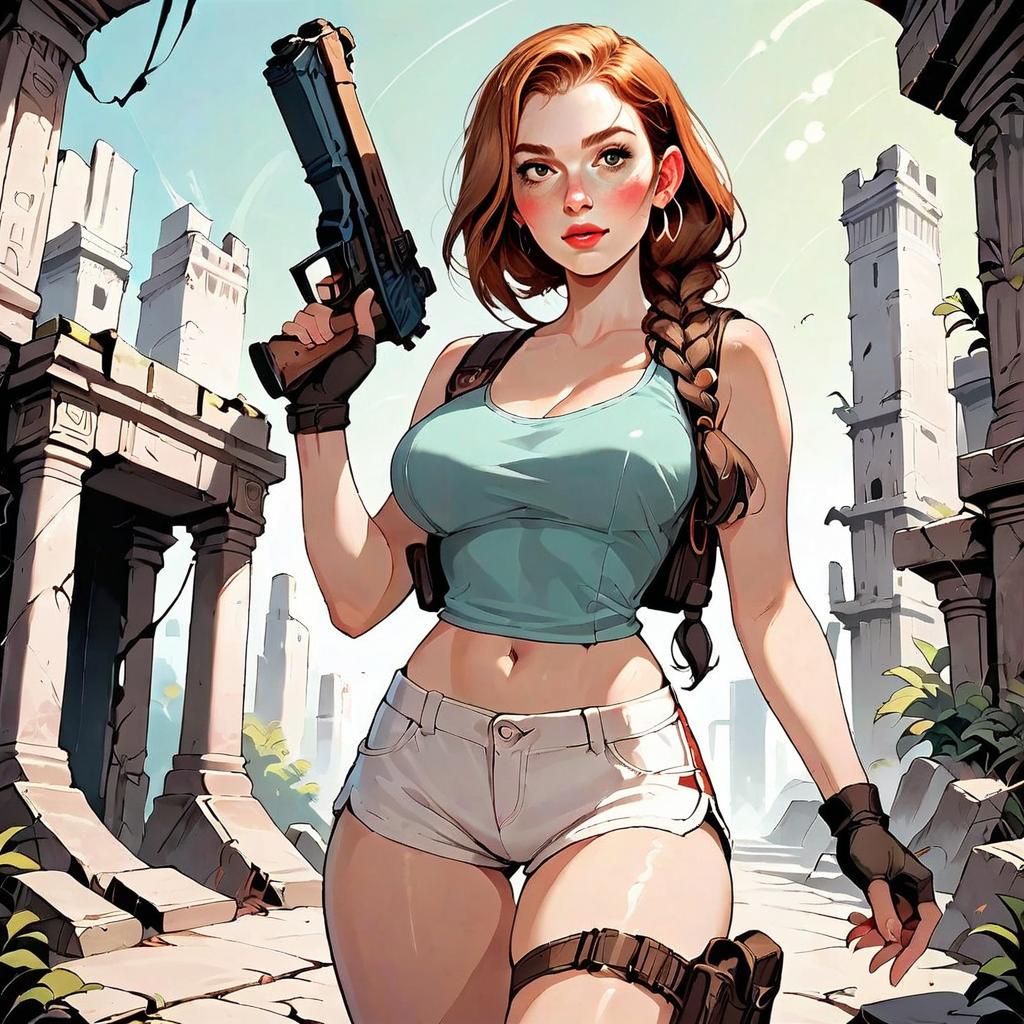 A confident woman with long braided hair stands amidst ancient ruins, holding a large handgun in her right hand. She wears a teal crop top, white shorts, and fingerless gloves, evoking a stylized adventurous and action-hero vibe reminiscent of video game characters. The digital artwork features vibrant colors, strong linework, and a dynamic composition typical of modern comic or game-inspired art.