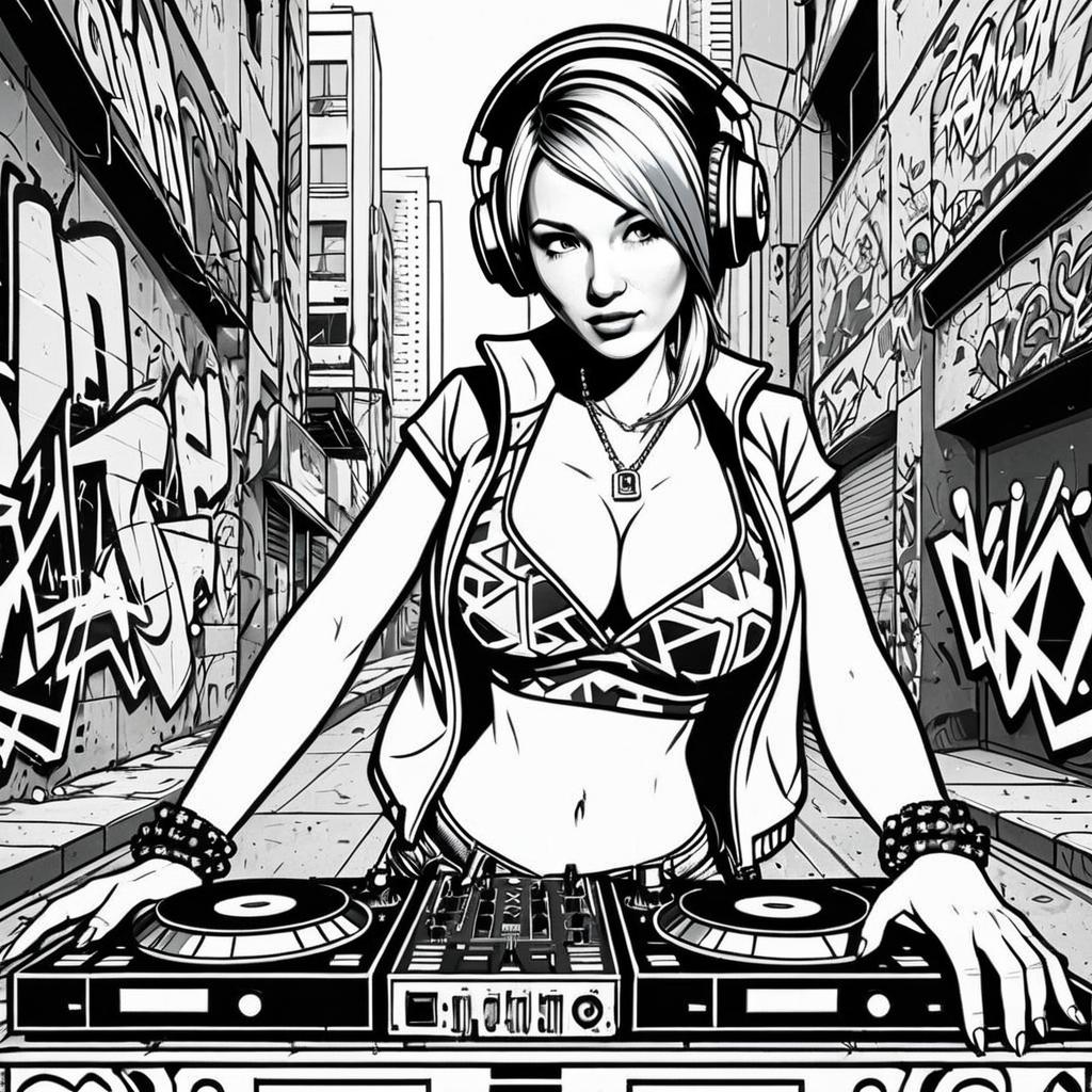 A stylish woman DJ in an urban alley filled with graffiti is intensely mixing music on turntables. This black-and-white digital illustration features strong lines and high contrast, capturing a modern and edgy street art vibe.