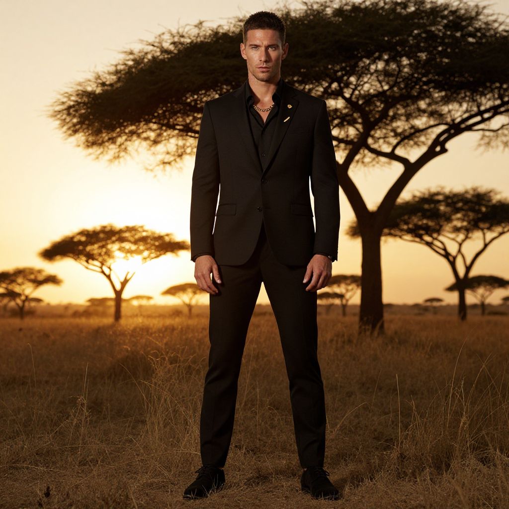 A man in a sharp black suit stands confidently in a wild savanna landscape during sunset, with acacia trees silhouetted against the warm golden sky. The dramatic lighting and natural backdrop create a striking contrast with his formal attire, blending elegance with wilderness.