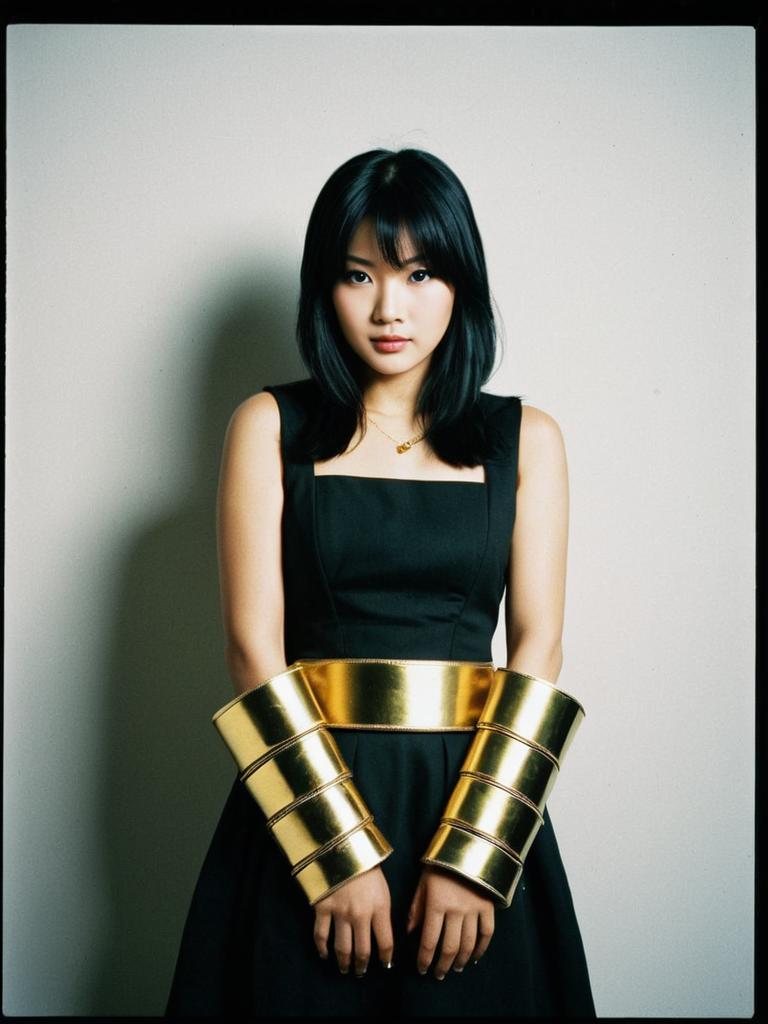 A stylish woman stands confidently wearing a sleek black dress paired with striking gold cuff bracelets and a matching gold belt. The minimalistic background highlights the modern and elegant costume design, emphasizing the bold accessories and the woman's poised demeanor.