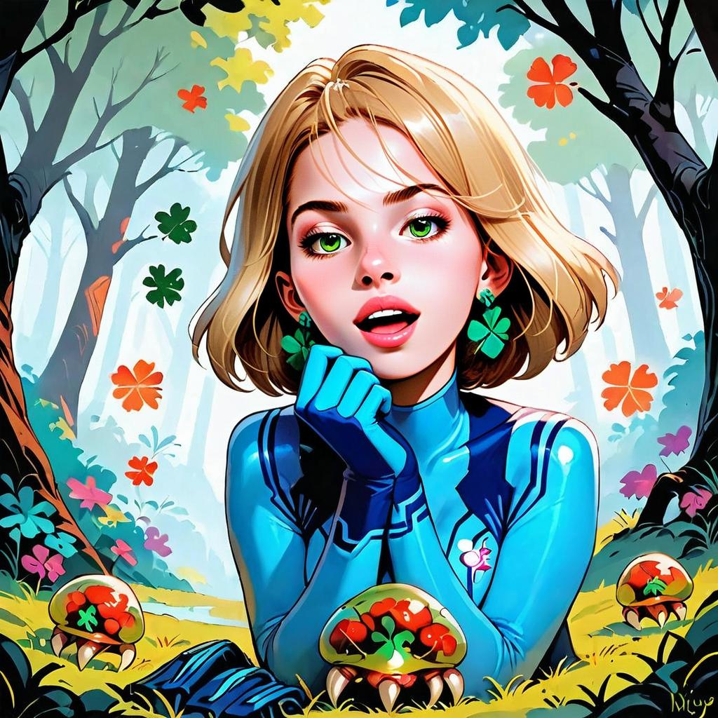 This vibrant digital artwork features a woman with striking green eyes and blonde hair, dressed in a futuristic blue suit with matching gloves. She is surrounded by whimsical, colorful creatures and foliage in a lush, enchanted forest setting, rendered in a smooth, anime-inspired style with bold outlines and vivid colors.