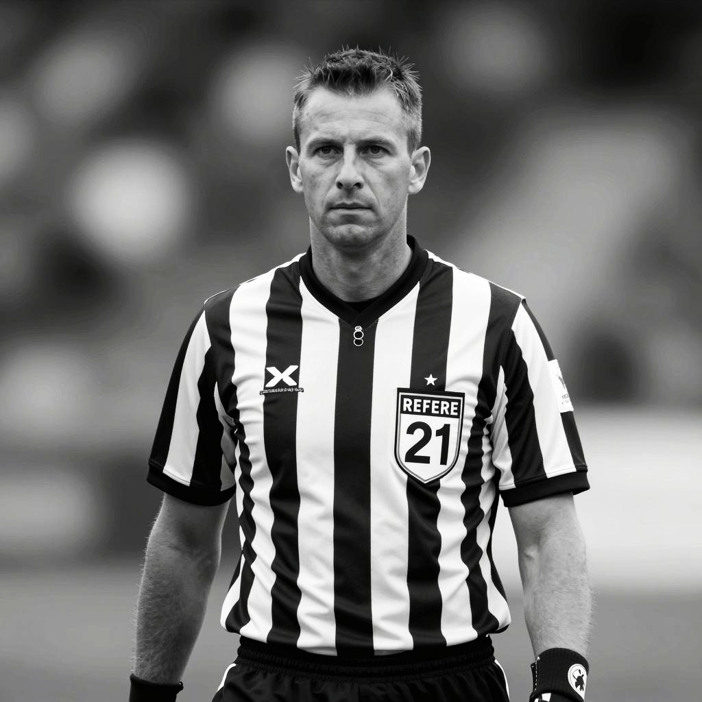 A focused male referee is pictured wearing a black and white striped uniform with a 'REFEREE 21' badge on his chest. The black and white photo highlights his serious expression and the classic style of the sports officiating apparel.