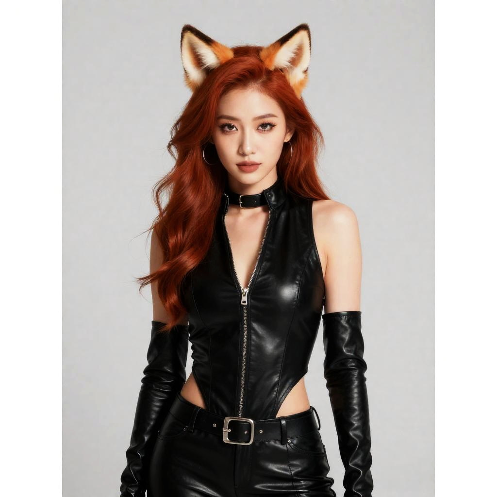 A confident woman with long red hair poses against a neutral background, wearing a sleek black leather outfit including a zipped top, matching gloves, and a belt. She completes her fierce look with large hoop earrings and distinctive fox ears, blending edgy fashion with playful fantasy elements.