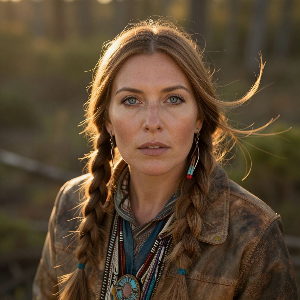 A close-up portrait of a woman with long braided hair and striking blue eyes, dressed in a rustic leather jacket and adorned with Native American-inspired jewelry. The soft sunlight highlights her natural beauty, set against a blurred outdoor background, evoking a sense of connection with nature.