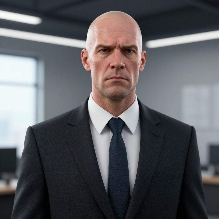 A serious bald man wearing a dark suit and tie stands confidently in a modern office environment. The image captures a professional corporate atmosphere with soft, natural lighting and a blurred background showcasing office desks and windows.