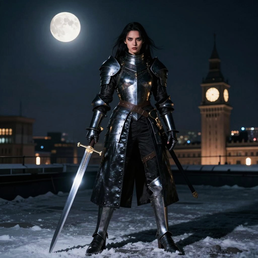 A fierce woman clad in shiny medieval armor stands poised with a sword under a full moon at night. The dramatic lighting highlights her determined expression, combining elements of historical armor with a modern cityscape in the background featuring a clock tower.