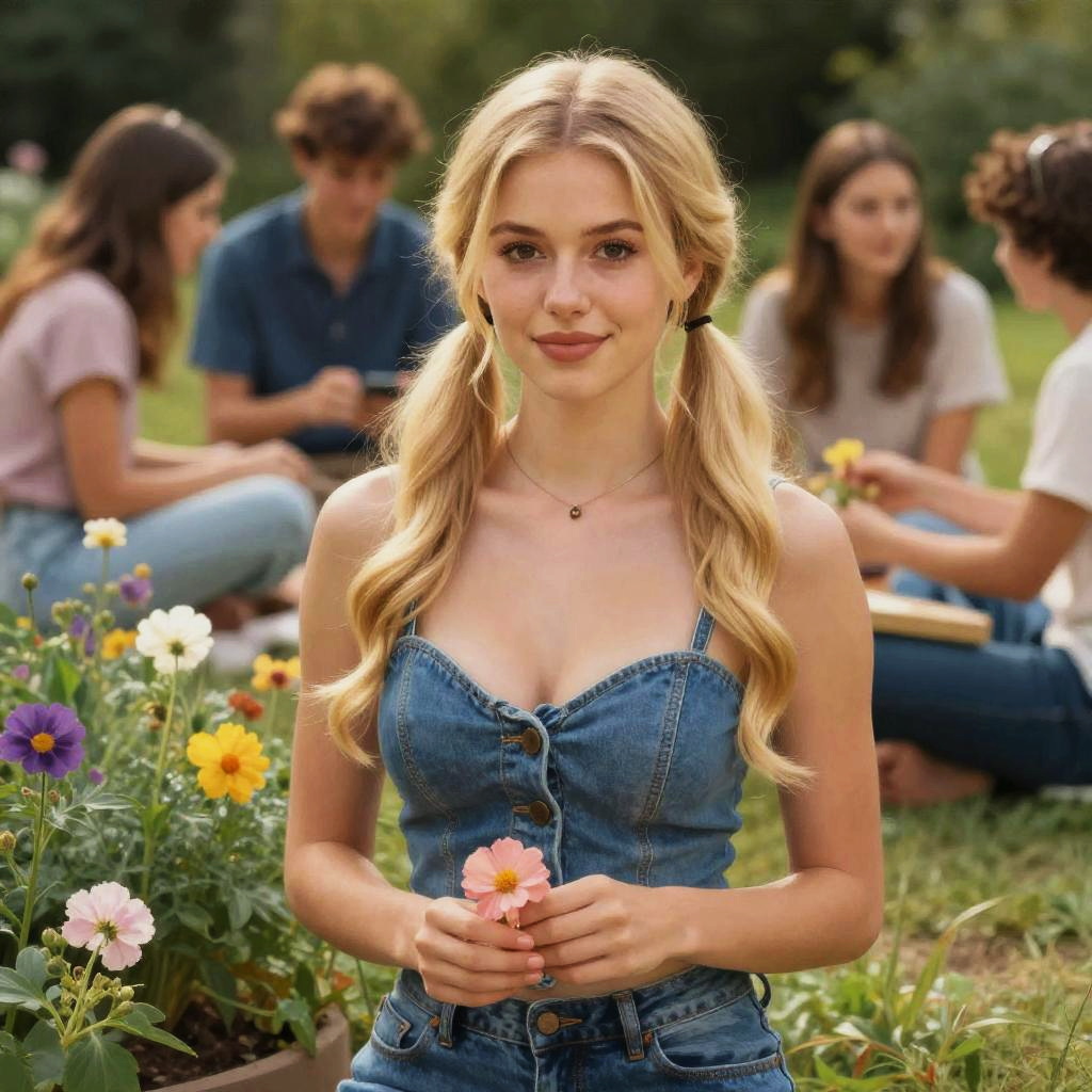 A young blonde woman with wavy hair styled in pigtails smiles gently while holding a pink flower in a garden filled with colorful blooms. She is dressed in a denim top and jeans, embodying a casual, youthful style that resonates with Gen Z aesthetics. In the softly blurred background, a group of teenagers enjoys a relaxed outdoor gathering, enhancing the natural and social vibe of the scene.
