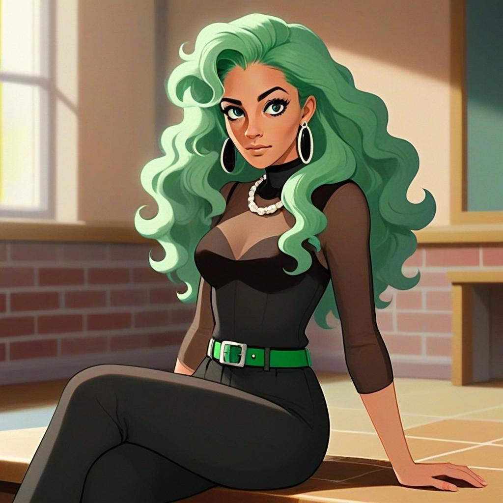 A stylish woman with voluminous mint-green hair is seated confidently indoors, framed by soft natural light. She wears a chic black outfit with sheer sleeves, accessorized with a green belt, pearl necklace, and large hoop earrings, all rendered in a polished digital illustration style reminiscent of modern animated character design.