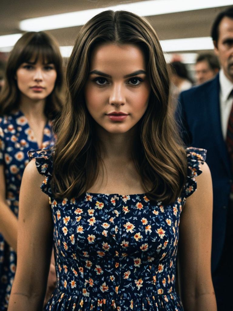 This image features a young woman in a navy blue floral dress with ruffled sleeves, standing confidently in the foreground while another woman and a man are blurred in the background. The style of the photograph has a cinematic quality, reminiscent of the Stranger Things series, with sharp focus on the subject’s face and soft background bokeh.