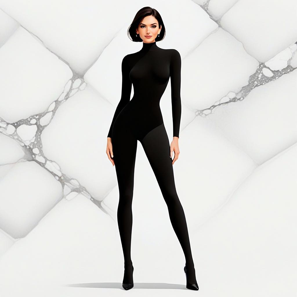 A confident woman stands poised against a modern, abstract white and gray geometric background. She is dressed in a sleek, form-fitting black bodysuit with long sleeves and black high heels, embodying a minimalist yet bold fashion style.
