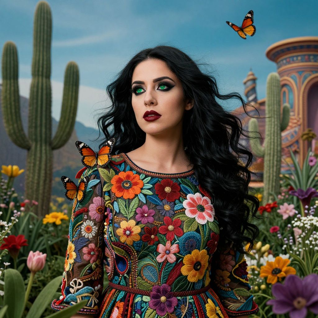 A striking woman with long black hair and vivid green eyes stands amidst a vibrant desert garden filled with colorful flowers, butterflies, and towering cacti. She wears an intricately embroidered floral dress that complements the vivid natural surroundings blending elements of traditional Mexican style with surreal beauty.