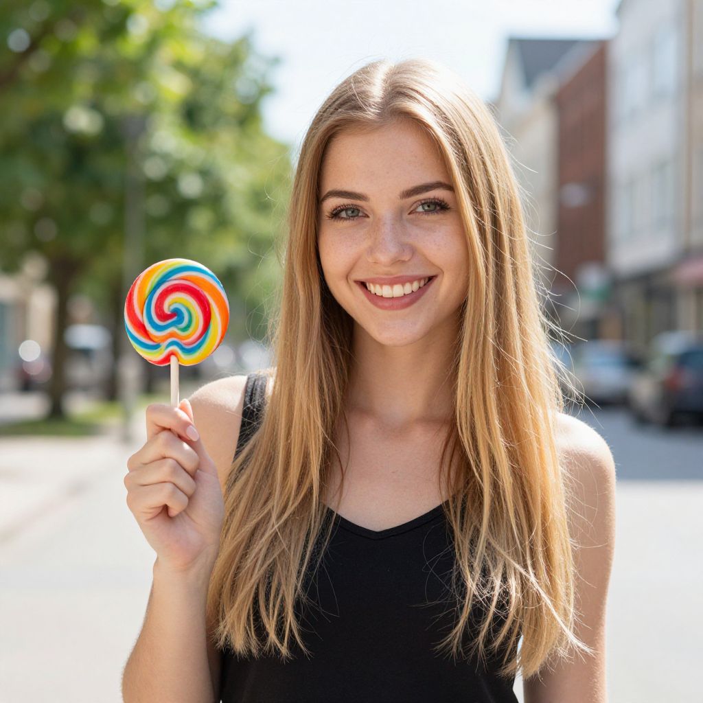 A young woman with long blonde hair smiles brightly while holding a colorful swirled lollipop outdoors on a sunny day. The blurred urban background highlights her happy expression and casual black tank top, creating a cheerful and vibrant atmosphere.