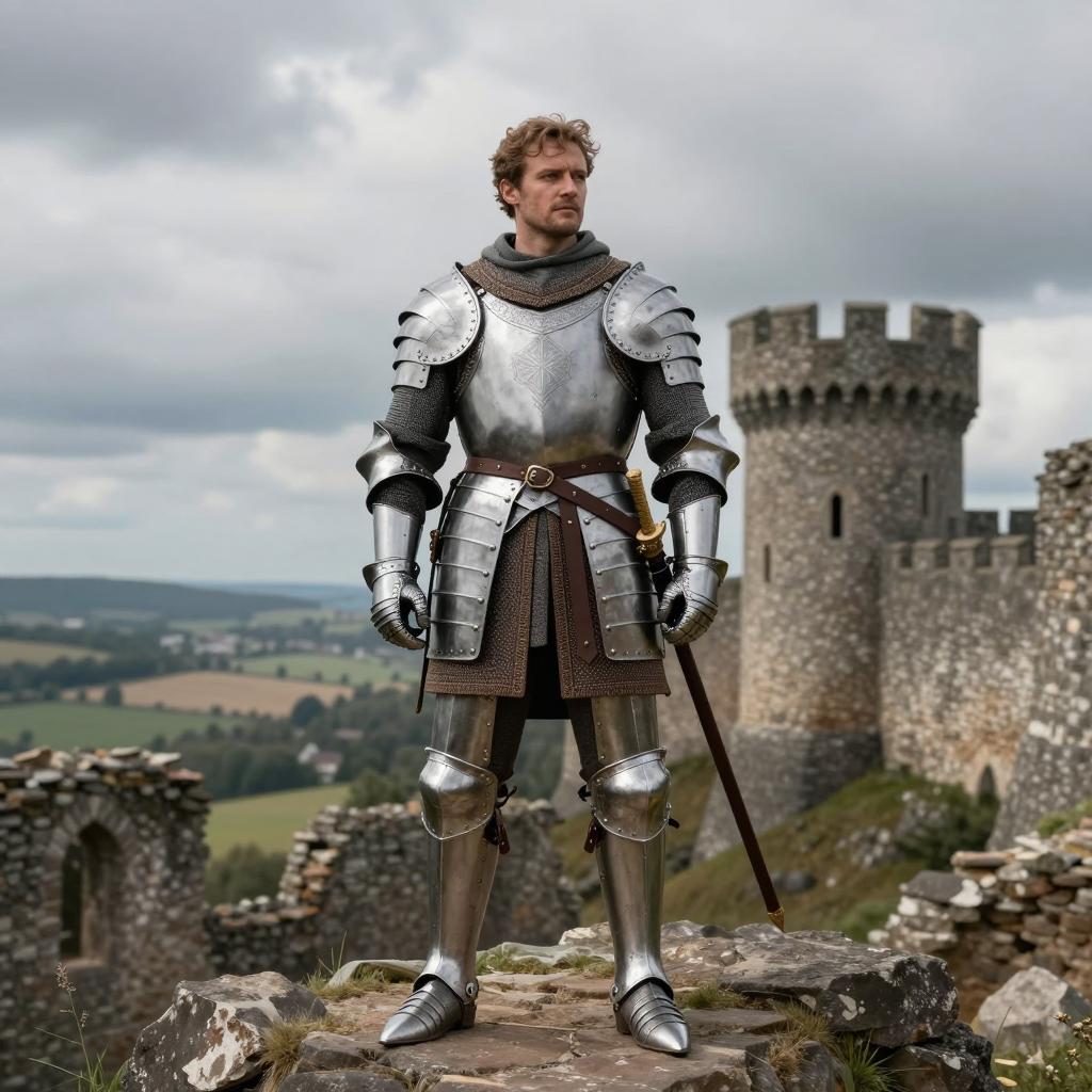 A man clad in shining medieval armor stands confidently on stone ruins with a historic castle tower in the background. The cloudy sky and expansive countryside enhance the epic and historical atmosphere of the scene.