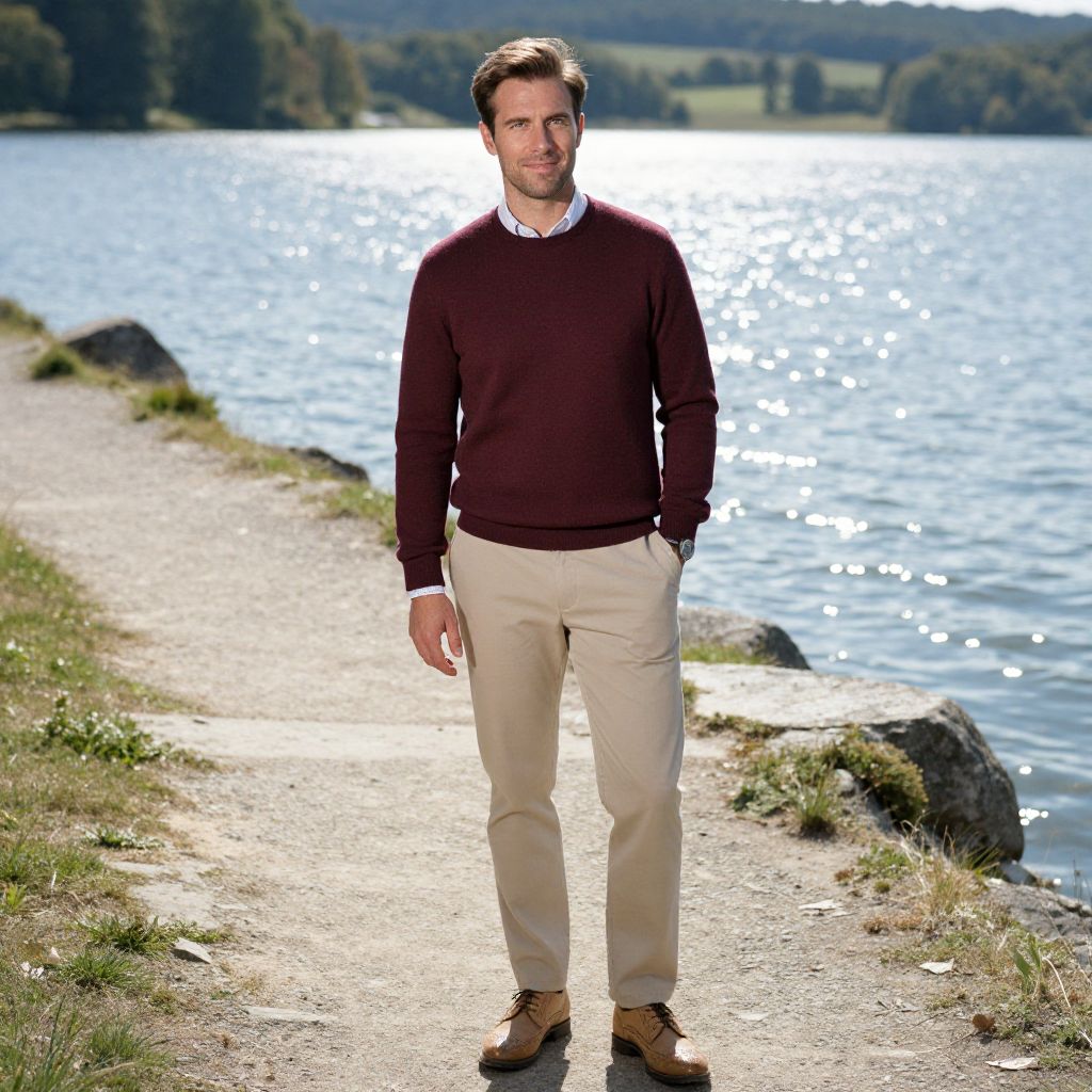 A confident man stands on a lakeside path, dressed in a burgundy sweater, beige pants, and brown shoes. The serene background features sparkling water and lush greenery, capturing a crisp, natural outdoor setting.
