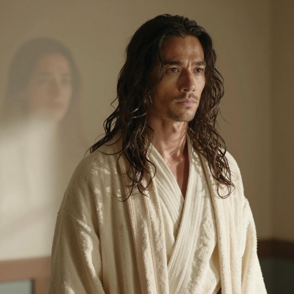 A man with long, wavy hair stands contemplatively in a softly lit room, wearing a textured white bathrobe. In the background, the blurred silhouette of a woman adds a subtle, mysterious element to the scene, creating an intimate and reflective atmosphere.