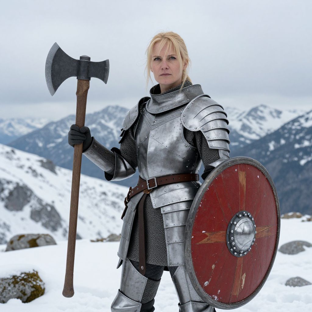 A determined woman clad in full medieval armor stands firmly in a snowy mountain landscape, gripping a battle axe in one hand and a round shield adorned with a faded red and gold cross in the other. The image captures the strength and resilience of a warrior prepared for battle amidst a crisp, wintery backdrop.