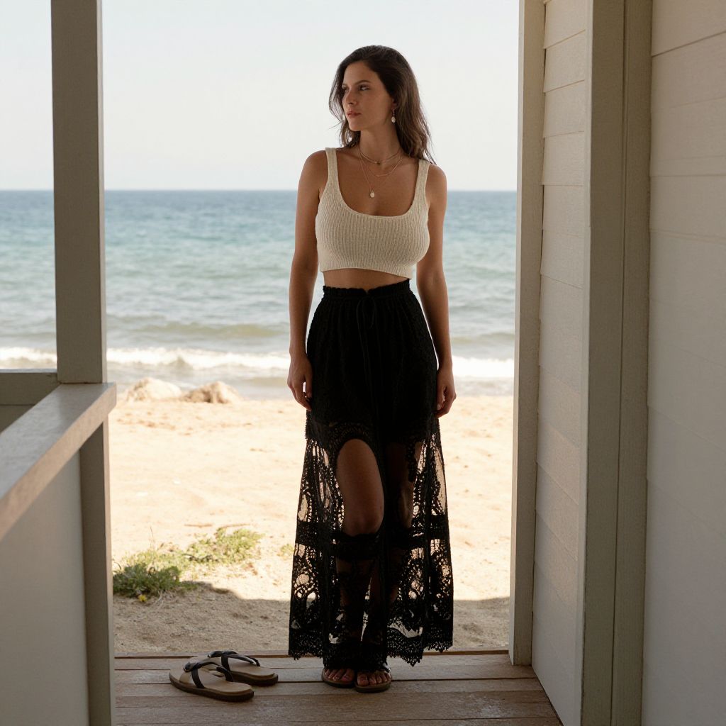 A woman stands in the doorway of a beachside cabin, looking contemplatively towards the ocean. She wears a white knitted crop top paired with a black lace maxi skirt, exuding a bohemian summer style against the serene backdrop of sand and sea.
